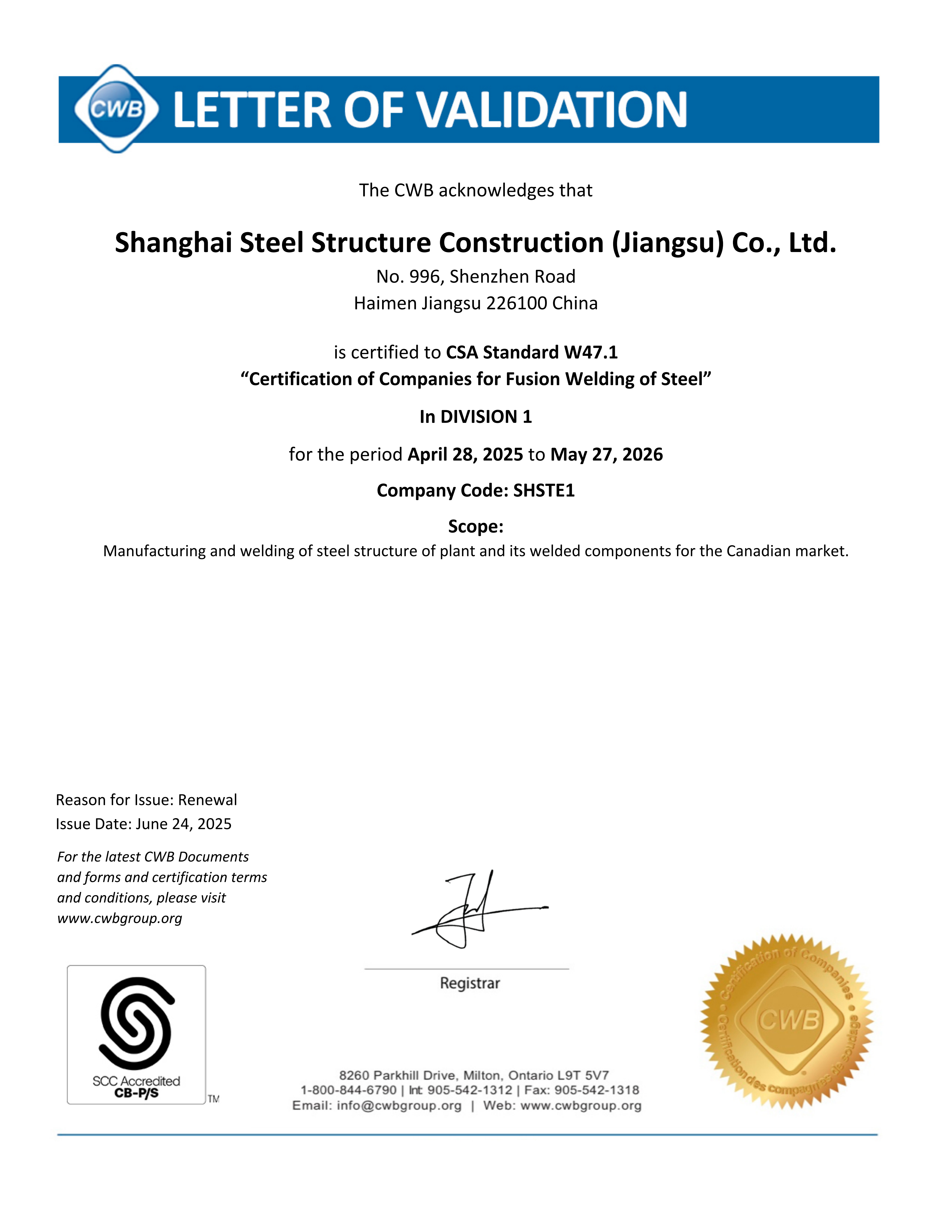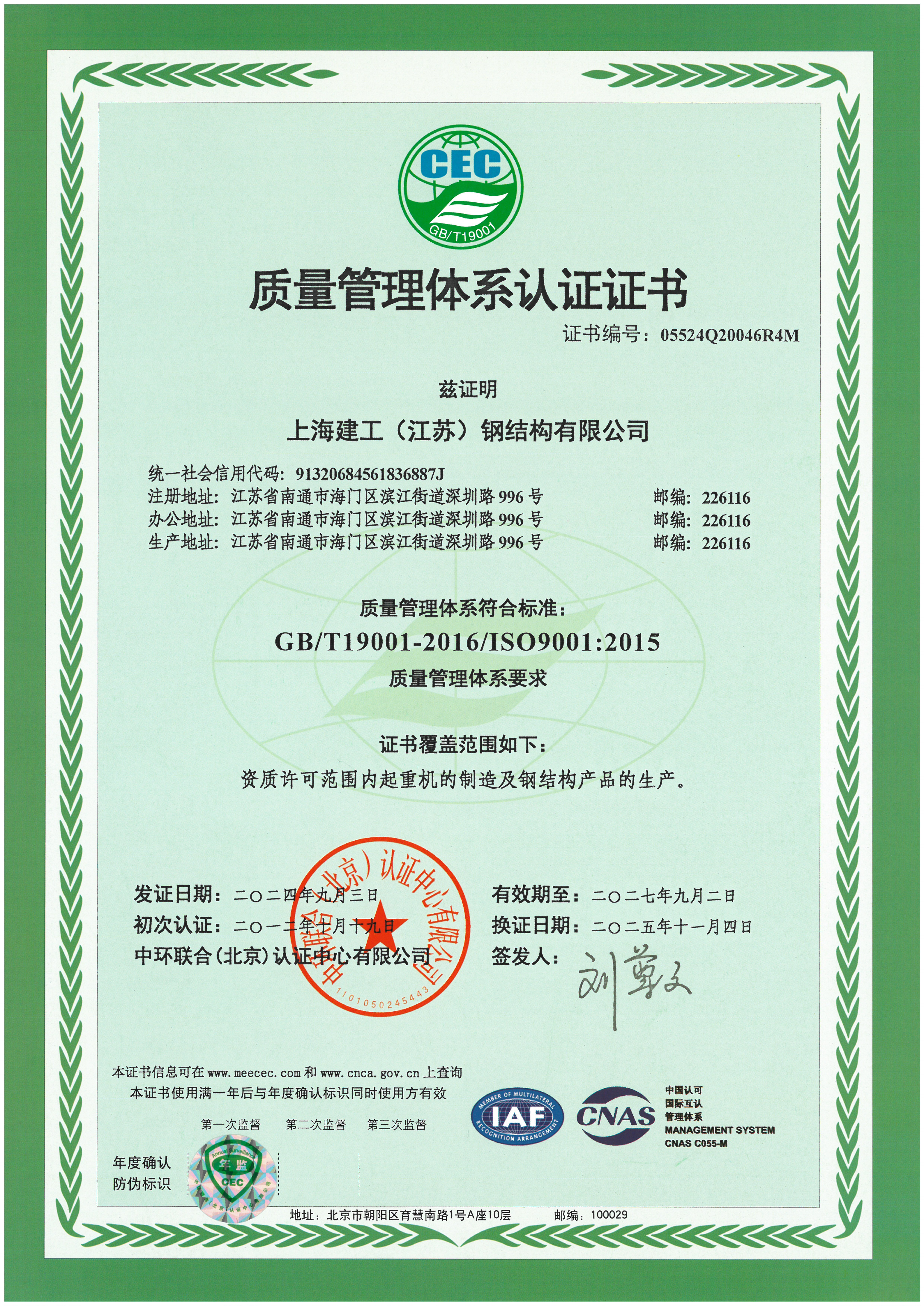 上海建工(江苏)钢结构有限公司始建于2010年9月,公司位于江苏省海门市滨江街道工业园区濒江核心区域,与长达2.5公里的新江海河内河岸线300米之隔,总投资15亿元,是上海建工(集团)有限公司独资成立的大型现代化钢结构制造企业,全国单体最大的钢结构产业化基地之一。